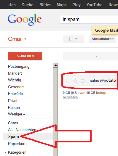 Die Email landete vermutlich im Spam oder Junk Ordner Ihres Emailprogramms. Wenn Sie Gmail, Googlemail etc. verwenden, erreichen Sie den Spam Ordner wie im Bild unten gezeigt: